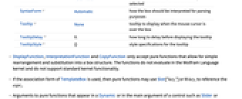 BaseStyle {} the style to use CopyFunction Automatic pure function that assembles boxi into a box structure used when copying to the clipboard DisplayFunction None pure function that assembles boxi into a box structure for display Editable Automatic whether to allow boxi to be edited InterpretationFunction Automatic pure function that assembles boxi into a box structure for evaluation Selectable Automatic whether to allow boxi to be individually selected SyntaxForm Automatic how the box should be interpreted for parsing purposes Tooltip None tooltip to display when the mouse cursor is over the box TooltipDelay 0. how long to delay before displaying the tooltip TooltipStyle {} style specifications for the tooltip - DisplayFunction, InterpretationFunction and CopyFunction only accept pure functions that allow for simple rearrangement and substitution into a box structure. The functions do not evaluate in the Wolfram Language kernel and do not support standard kernel functionality.