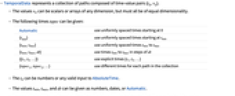 Automatic use uniformly spaced times starting at 0 {tmin} use uniformly spaced times starting at tmin {tmin,tmax} use uniformly spaced times tmin to tmax {tmin,tmax,dt} use times tmin to tmax in steps of dt {{t1,t2,…}} use explicit times {t1,t2,…} {tspec1,tspec2,…} use different times for each path in the collection - The tij can be numbers or any valid input to AbsoluteTime.
