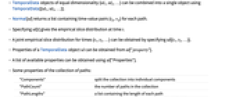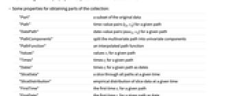 "Part" a subset of the original data "Path" time-value pairs {tij,vij} for a given path "DatePath" date-value pairs {dateij,vij} for a given path "PathComponents" split the multivariate path into univariate components "PathFunction" an interpolated path function "Values" values vi for a given path "Times" times ti for a given path "Dates" times ti for a given path as dates "SliceData" a slice through all paths at a given time "SliceDistribution" empirical distribution of slice data at a given time "FirstTime" the first time t1 for a given path "FirstDate" the first time t1 for a given path as date "LastTime" the last time for a given path "LastDate" the last time for a given path as date "FirstValue" the value v1 at the first time for a given path "LastValue" the value at the last time for a given path - Specifying td["Path",p] gives the time-value pairs for the paths specified by p, where p can be any valid Part specification.