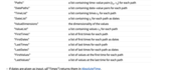 "Components" split the collection into individual components "PathCount" the number of paths in the collection "PathLengths" a list containing the length of each path "Paths" a list containing time-value pairs {tij,vij} for each path "DatePaths" a list containing date-value pairs for each path "TimeList" a list containing times tij for each path "DateList" a list containing tij for each path as dates "ValueDimensions" the dimensionality of the values "ValueList" a list containing values vij for each path "FirstTimes" a list of first times for each path "FirstDates" a list of first times for each path as dates "LastTimes" a list of last times for each path "LastDates" a list of last times for each path as dates "FirstValues" a list of values at the first time for each path "LastValues" a list of values at the last time for each path - If dates are given as input, td["Times"] returns them in AbsoluteTime.