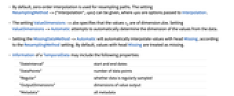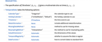 CalendarType "Gregorian" the calendar type to use HolidayCalendar {"UnitedStates","Default"} the holiday calendar to use TimeZone $TimeZone the time zone to use MetaInformation None include additional metainformation MissingDataMethod None method to use for missing values ResamplingMethod "Interpolation" the method to use for resampling paths ValueDimensions Automatic the dimensions of the values TemporalRegularity Automatic whether to assume the data is regular DateFunction Automatic how to convert dates to standard form - By default, zero-order interpolation is used for resampling paths. The setting ResamplingMethod->{"Interpolation",opts} can be given, where opts are options passed to Interpolation.