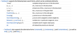 "string" complete string must occur in the document {s1,s2,…} all si must occur in the document s1|s2|… at least one of the si must occur in the document "field"s1 the si must occur in the given field FixedOrder[s1,s2,…] the si must occur in the order given Except[q] q cannot occur in the document SearchAdjustment[q,…] q occurs and is assigned a certain weight etc. Between[…],LessThan[…],… numbers etc. in particular ranges etc. occur SearchQueryString["query"] complete search-engine-style query All all indexed documents are returned - TextSearch also supports the alternative forms ContainsAll[…], ContainsAny[…] and ContainsNone[…], as well as And[…], Or[…] and Not[…].
