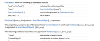 "path" or File["path"] individual file or directory of files "name" SearchIndexObject["name"] SearchIndexObject[…] search index generated by CreateSearchIndex {obj1,obj2,…} list of objects - TextSearch[source,form] returns a SearchResultObject[…] expression.