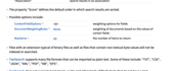 ContentFieldOptions <||> weighting options for fields DocumentWeightingRules None weighting of documents based on the values of certain fields MaxItems All the number of items to return - Files with an extension typical of binary files as well as files that contain non-textual byte values will not be indexed or searched.