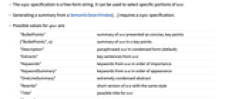 "BulletPoints" summary of text presented as concise, key points {"BulletPoints",n} summary of text in n key points "Description" paraphrased text in condensed form (default) "Extracts" key sentences from text "Keywords" keywords from text in order of importance "KeywordSummary" keywords from text in order of appearance "OneLineSummary" extremely condensed abstract "Rewrite" short version of text with the same style "Title" possible title for text "Topics" main topics in text - Additionally, custom values for spec can be specified using: