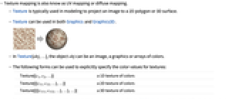 - Texture[obj,map] provides a texture obj that can be applied to faces of polygons and surfaces by assigning coordinates to vertices from the projection mapping map.