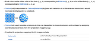 Texture[{c1,c2,…}] a 1D texture of colors Texture[{{c11,c12,…},…}] a 2D texture of colors Texture[{{{c111,c112,…},…},…}] a 3D texture of colors - Each color can be either a list of the form {r,g,b} corresponding to RGBColor[r,g,b] or a list of the form {r,g,b,a} corresponding to RGBColor[r,g,b,a].