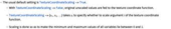 - TextureCoordinateScaling->{s1,s2,…} takes si to specify whether to scale argument i of the texture coordinate function.
