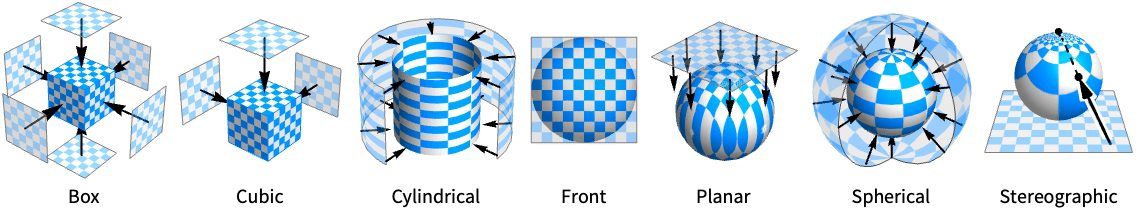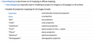 Automatic automatically choose the projection None no projection "Box" box projection "Cubic" cubic projection "Cylindrical" cylindrical projection "Front" planar project on the x–y plane "Planar" planar projection "Spherical" spherical projection "Stereographic" stereographic projection - The projection is separately mapped to each individual primitive specified in the graphic. If a texture is mapped onto a Polygon expression containing multiple polygons, then the texture will be mapped over the entire region covered by the set of polygons. »