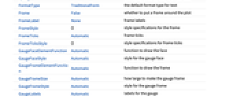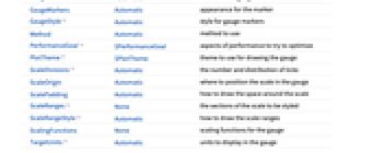 AlignmentPoint Center the default point in the graphic to align with AspectRatio Automatic ratio of height to width Axes False whether to draw axes AxesLabel None axes labels AxesOrigin Automatic where axes should cross AxesStyle {} style specifications for the axes Background None background color for the plot BaselinePosition Automatic how to align with a surrounding text baseline BaseStyle {} base style specifications for the graphic ContentSelectable Automatic whether to allow contents to be selected CoordinatesToolOptions Automatic detailed behavior of the coordinates tool Epilog {} primitives rendered after the main plot FormatType TraditionalForm the default format type for text Frame False whether to put a frame around the plot FrameLabel None frame labels FrameStyle {} style specifications for the frame FrameTicks Automatic frame ticks FrameTicksStyle {} style specifications for frame ticks GaugeFaceElementFunction Automatic function to draw the face GaugeFaceStyle Automatic style for the gauge face GaugeFrameElementFunction Automatic function to draw the frame GaugeFrameSize Automatic how large to make the gauge frame GaugeFrameStyle Automatic style for the gauge frame GaugeLabels Automatic labels for the gauge GaugeMarkers Automatic appearance for the marker GaugeStyle Automatic style for gauge markers GridLines None grid lines to draw GridLinesStyle {} style specifications for grid lines ImageMargins 0. the margins to leave around the graphic ImagePadding All what extra padding to allow for labels etc. ImageSize Automatic the absolute size at which to render the graphic LabelStyle {} style specifications for labels Method Automatic method to use PerformanceGoal $PerformanceGoal aspects of performance to try to optimize PlotLabel None an overall label for the plot PlotRange All range of values to include PlotRangeClipping False whether to clip at the plot range PlotRangePadding Automatic how much to pad the range of values PlotRegion Automatic the final display region to be filled PlotTheme $PlotTheme theme to use for drawing the gauge PreserveImageOptions Automatic whether to preserve image options when displaying new versions of the same graphic Prolog {} primitives rendered before the main plot RotateLabel True whether to rotate y labels on the frame ScaleDivisions Automatic the number and distribution of ticks ScaleOrigin Automatic where to position the scale in the gauge ScalePadding Automatic how to draw the space around the scale ScaleRanges None the sections of the scale to be styled ScaleRangeStyle Automatic how to draw the scale ranges ScalingFunctions None scaling functions for the gauge TargetUnits Automatic units to display in the gauge Ticks Automatic axes ticks TicksStyle {} style specifications for axes ticks