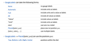 None no gauge labels Automatic include units as labels Full include units and a value as labels All include all values as labels "Value" include values as labels "Unit" include units as labels label use label as a label Placed[label,pos] place label at position pos {label1,label2,…} use multiple labels - GaugeLabels->Placed[label,pos] can use the positions pos: