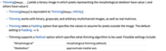 - Thinning takes a Padding option that specifies the values to assume for pixels outside the image. The default setting is Padding->0.