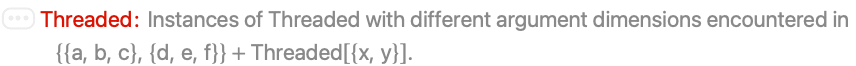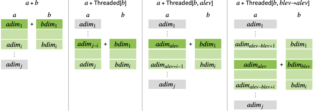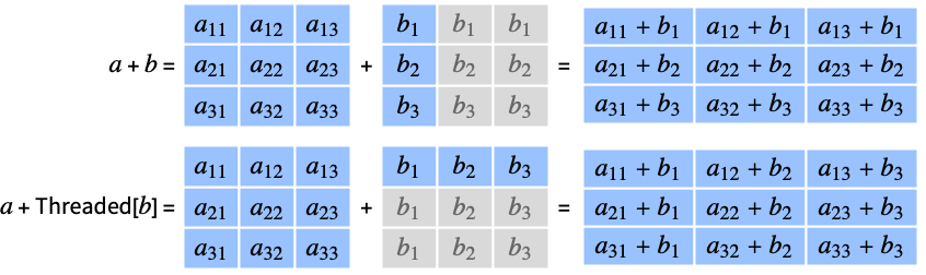 - In a+Threaded[b], the lowest-level dimensions of a must match the dimensions of b.