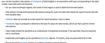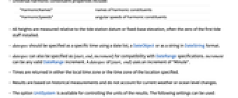 "Elevation" elevation "HarmonicAmplitudes" amplitudes of harmonic constituents for input "HarmonicPhases" phases of harmonic constituents for input "MeanTideLevel" average level of tide - Universal harmonic constituent properties include: