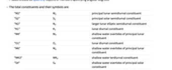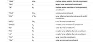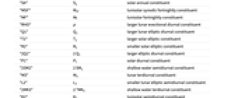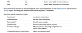 "M2" M2 principal lunar semidiurnal constituent "S2" S2 principal solar semidiurnal constituent "N2" N2 larger lunar elliptic semidiurnal constituent "K1" K1 lunar diurnal constituent "M4" M4 shallow water overtides of principal lunar constituent "O1" O1 lunar diurnal constituent "M6" M6 shallow water overtides of principal lunar constituent "MK3" MK3 shallow water terdiurnal constituent "S4" S4 shallow water overtides of principal solar constituent "MN4" MN4 shallow water quarter diurnal constituent "NU2" ν2 larger lunar evectional constituent "S6" S6 shallow water overtides of principal solar constituent "MU2" MU2 variational constituent "2N2" 2"N2 lunar elliptical semidiurnal second-order constituent "OO1" OO1 lunar diurnal constituent "LAM2" λ2 smaller lunar evectional constituent "S1" S1 solar diurnal constituent "M1" M1 smaller lunar elliptic diurnal constituent "J1" J1 smaller lunar elliptic diurnal constituent "MM" Mm lunar monthly constituent "SSA" Ssa solar semiannual constituent "SA" Sa solar annual constituent "MSF" Msf lunisolar synodic fortnightly constituent "MF" Mf lunisolar fortnightly constituent "RHO" ρ larger lunar evectional diurnal constituent "Q1" Q1 larger lunar elliptic diurnal constituent "T2" T2 larger solar elliptic constituent "R2" R2 smaller solar elliptic constituent "2Q1" 2Q1 larger elliptic diurnal constituent "P1" P1 solar diurnal constituent "2SM2" 2SM2 shallow water semidiurnal constituent "M3" M3 lunar terdiurnal constituent "L2" L2 smaller lunar elliptic semidiurnal constituent "2MK3" 2"MK3 shallow water terdiurnal constituent "K2" K2 lunisolar semidiurnal constituent "M8" M8 shallow water eighth diurnal constituent "MS4" MS4 shallow water quarter diurnal constituent - A location can be specified by latitude/longitude pairs, assuming degrees as units, a GeoPosition specification or Entity objects, assuming they represent objects with geographic coordinates.