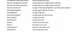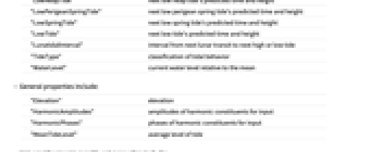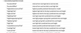 "DurationOfFall" interval from next high tide to next low tide "DurationOfRise" interval from next low tide to next high tide "HighestAstronomicalTide" highest possible predicted tide based on model "HighHighTide" highest high tide for the day's predicted time and height "HighLowTide" highest low tide for the day's predicted time and height "HighNeapTide" next high neap tide's predicted time and height "HighPerigeanSpringTide" next high perigean spring tide's perdicted time and height "HighSpringTide" next high spring tide's predicted time and height "HighTide" next high tide's predicted time and height "LowestAstronomicalTide" lowest possible predicted tide based on model "LowHighTide" lowest high tide for the day's predicted time and height "LowLowTide" lowest low tide for the day's predicted time and height "LowNeapTide" next low neap tide's predicted time and height "LowPerigeanSpringTide" next low perigean spring tide's predicted time and height "LowSpringTide" next low spring tide's predicted time and height "LowTide" next low tide's predicted time and height "LunatidalInterval" interval from next lunar transit to next high or low tide "TideType" classification of tidal behavior "WaterLevel" current water level relative to the mean - General properties include:
