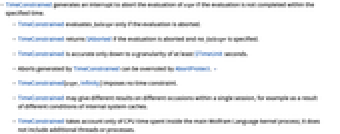 - TimeConstrained takes account only of CPU time spent inside the main Wolfram Language kernel process; it does not include additional threads or processes.