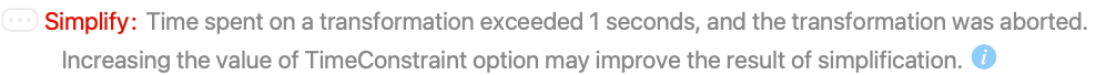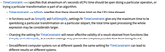 - In functions such as Simplify and FullSimplify, settings for TimeConstraint give only the maximum time to be spent doing a particular transformation on a particular subpart; the total time spent processing the whole expression may be considerably larger.