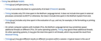 - Timing includes only CPU time spent in the Wolfram Language kernel. It does not include time spent in external processes connected via WSTP or otherwise. Nor does it include time spent in the Wolfram System front end.