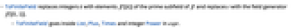 - ToFiniteField replaces integers k with elements ff[{k}] of the prime subfield of ff and replaces t with the field generator ff[{0,1}].