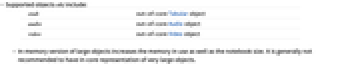 otab out-of-core Tabular object audio out-of-core Audio object video out-of-core Video object - In-memory version of large objects increases the memory in use as well as the notebook size. It is generally not recommended to have in-core representation of very large objects.
