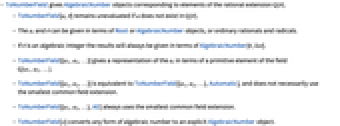 - ToNumberField[{a1,a2,…}] gives a representation of the ai in terms of a primitive element of the field