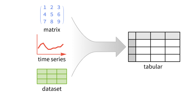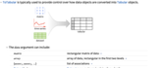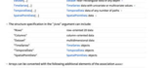 "Rows" row-oriented 2D data "Columns" column-oriented data "Dataset" multidimensional data "TimeSeries" TimeSeries objects "TemporalData" TemporalData objects "SpatialPointData" SpatialPointData objects - Arrays can be converted with the following additional elements of the association assoc: