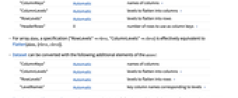 "ColumnKeys" Automatic names of columns » "ColumnLevels" Automatic levels to flatten into columns » "RowLevels" Automatic levels to flatten into rows "HeaderRows" 0 number of rows to use as column keys » - For array data, a specification {"RowLevels"rlevs,"ColumnLevels"clevs} is effectively equivalent to Flatten[data,{rlevs,clevs}].