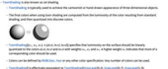 - ToonShading[col] uses dark, base and highlight colors obtained by blending col with Black, Gray and White.