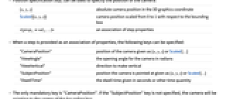 {x,y,z} absolute camera position in the 3D graphics coordinate Scaled[{x,y,z}] camera position scaled from 0 to 1 with respect to the bounding box <|prop1val1,…|> an association of step properties - When a step is provided as an association of properties, the following keys can be specified: