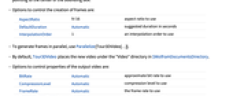 BitRate Automatic approximate bit rate to use CompressionLevel Automatic compression level to use FrameRate Automatic the frame rate to use GeneratedAssetFormat Automatic the format of the result GeneratedAssetLocation $GeneratedAssetLocation the location of the result OverwriteTarget False whether to overwrite an existing file RasterSize Automatic raster size of the output video VideoEncoding Automatic video encoding to use VideoTransparency False whether the output video should have a transparency channel
