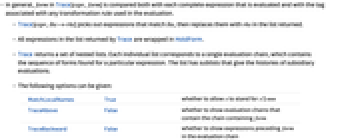 MatchLocalNames True whether to allow x to stand for x$nnn TraceAbove False whether to show evaluation chains that contain the chain containing form TraceBackward False whether to show expressions preceding form in the evaluation chain TraceDepth Infinity how many levels of nested evaluations to include TraceForward False whether to show expressions following form in the evaluation chain TraceOff None forms within which to switch off tracing TraceOn _ forms within which to switch on tracing TraceOriginal False whether to look at expressions before their heads and arguments are evaluated - During the execution of Trace, the settings for the form argument, and for the options TraceOn and TraceOff, can be modified by resetting the values of the global variables $TracePattern, $TraceOn, and $TraceOff, respectively.