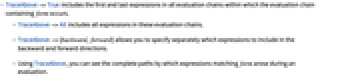- TraceAbove->True includes the first and last expressions in all evaluation chains within which the evaluation chain containing form occurs.