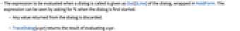 - The expression to be evaluated when a dialog is called is given as Out[$Line] of the dialog, wrapped in HoldForm. The expression can be seen by asking for % when the dialog is first started.