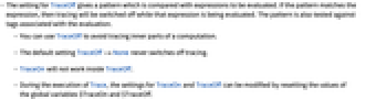 - During the execution of Trace, the settings for TraceOn and TraceOff can be modified by resetting the values of the global variables $TraceOn and $TraceOff.