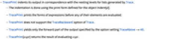 - TracePrint indents its output in correspondence with the nesting levels for lists generated by Trace.