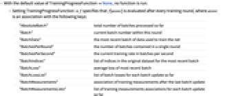 - Setting TrainingProgressFunctionf specifies that f[assoc] is evaluated after every training round, where assoc is an association with the following keys:
