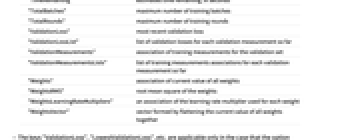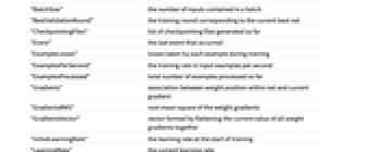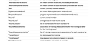 "AbsoluteBatch" total number of batches processed so far "Batch" current batch number within this round "BatchData" the most recent batch of data used to train the net "BatchesPerRound" the number of batches contained in a single round "BatchesPerSecond" the current training rate in batches per second "BatchIndices" list of indices in the original dataset for the most recent batch "BatchLoss" average loss of most recent batch "BatchLossList" list of batch losses for each batch update so far "BatchMeasurements" association of training measurements after the last batch update "BatchMeasurementsLists" list of training measurements associations for each batch update so far "BatchSize" the number of inputs contained in a batch "BestValidationRound" the training round corresponding to the current best net "CheckpointingFiles" list of checkpointing files generated so far "Event" the last event that occurred "ExampleLosses" losses taken by each example during training "ExamplesPerSecond" the training rate in input examples per second "ExamplesProcessed" total number of examples processed so far "Gradients" association between weight position within net and current gradient "GradientsRMS" root mean square of the weight gradients "GradientsVector" vector formed by flattening the current value of all weight gradients together "InitialLearningRate" the learning rate at the start of training "LearningRate" the current learning rate "MeanBatchesPerSecond" the mean number of batches processed per second "MeanExamplesPerSecond" the mean number of input examples processed per second "Net" current, partially trained network "OptimizationMethod" the name of the optimization method used "ProgressFraction" progress represented as a number between 0 and 1 "Round" current round number "RoundLoss" average loss of most recent round "RoundLossList" list of round losses for each round so far "RoundMeasurements" association of training measurements for the training set after the last training round "RoundMeasurementsLists" list of training measurements associations for each round so far "TargetDevice" the device used for training "TimeElapsed" time elapsed since training began, in seconds "TimeRemaining" estimated time remaining, in seconds "TotalBatches" maximum number of training batches "TotalRounds" maximum number of training rounds "ValidationLoss" most recent validation loss "ValidationLossList" list of validation losses for each validation measurement so far "ValidationMeasurements" association of training measurements for the validation set "ValidationMeasurementsLists" list of training measurements associations for each validation measurement so far "Weights" association of current value of all weights "WeightsRMS" root mean square of the weights "WeightsLearningRateMultipliers" an association of the learning rate multiplier used for each weight "WeightsVector" vector formed by flattening the current value of all weights together - The keys "ValidationLoss", "LowestValidationLoss", etc. are applicable only in the case that the option ValidationSet was specified to NetTrain.