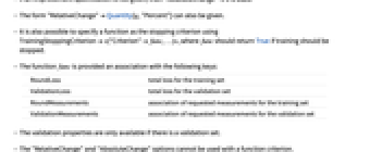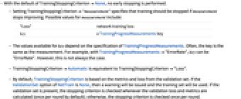 - TrainingStoppingCriterion has a number of suboptions that can be specified using the <|"Criterion""measurement",opt1val1,opt2val2,…|> syntax.