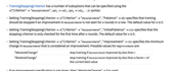 - Setting TrainingStoppingCriterion"measurement" specifies that training should be stopped if measurement stops improving. Possible values for measurement include: