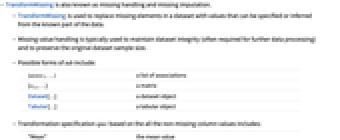 - TransformMissing is used to replace missing elements in a dataset with values that can be specified or inferred from the known part of the data.