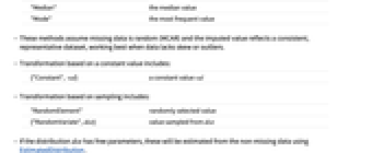 " Mean" the mean value "Median" the median value "Mode" the most frequent value - These methods assume missing data is random (MCAR) and the imputed value reflects a consistent, representative dataset, working best when data lacks skew or outliers.