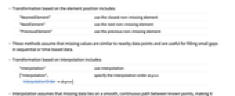"NearestElement" use the closest non-missing element "NextElement" use the next non-missing element "PreviousElement" use the previous non-missing element - These methods assume that missing values are similar to nearby data points and are useful for filling small gaps in sequential or time-based data.