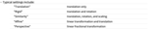 Wolfram Language. (2014). TransformationClass. Wolfram Language & System Documentation Center. Retrieved from https://reference.wolfram.com/language/ref/TransformationClass.html