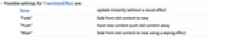 None update instantly without a visual effect "Fade" fade from old content to new "Push" have new content push old content away "Wipe" fade from old content to new using a wiping effect