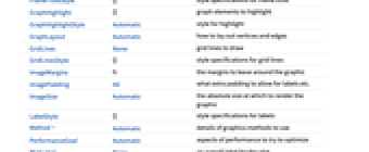 AlignmentPoint Center the default point in the graphic to align with AnnotationRules {} annotations for graph, edges and vertices AspectRatio Automatic ratio of height to width Axes False whether to draw axes AxesLabel None axes labels AxesOrigin Automatic where axes should cross AxesStyle {} style specifications for the axes Background None background color for the plot BaselinePosition Automatic how to align with a surrounding text baseline BaseStyle {} base style specifications for the graphic ContentSelectable Automatic whether to allow contents to be selected CoordinatesToolOptions Automatic detailed behavior of the coordinates tool DirectedEdges Automatic whether to interpret Rule as DirectedEdge EdgeLabels None labels and label placements for edges EdgeLabelStyle Automatic style to use for edge labels EdgeShapeFunction Automatic generate graphic shapes for edges EdgeStyle Automatic style used for edges EdgeWeight Automatic weights for edges Epilog {} primitives rendered after the main plot FormatType TraditionalForm the default format type for text Frame False whether to put a frame around the plot FrameLabel None frame labels FrameStyle {} style specifications for the frame FrameTicks Automatic frame ticks FrameTicksStyle {} style specifications for frame ticks GraphHighlight {} graph elements to highlight GraphHighlightStyle Automatic style for highlight GraphLayout Automatic how to lay out vertices and edges GridLines None grid lines to draw GridLinesStyle {} style specifications for grid lines ImageMargins 0. the margins to leave around the graphic ImagePadding All what extra padding to allow for labels etc. ImageSize Automatic the absolute size at which to render the graphic LabelStyle {} style specifications for labels Method Automatic details of graphics methods to use PerformanceGoal Automatic aspects of performance to try to optimize PlotLabel None an overall label for the plot PlotRange All range of values to include PlotRangeClipping False whether to clip at the plot range PlotRangePadding Automatic how much to pad the range of values PlotRegion Automatic the final display region to be filled PlotTheme $PlotTheme overall theme for the graph PreserveImageOptions Automatic whether to preserve image options when displaying new versions of the same graphic Prolog {} primitives rendered before the main plot RotateLabel True whether to rotate y labels on the frame Ticks Automatic axes ticks TicksStyle {} style specifications for axes ticks VertexCoordinates Automatic coordinates for vertices VertexLabels None labels and placements for vertices VertexLabelStyle Automatic style to use for vertex labels VertexShape Automatic graphic shape for vertices VertexShapeFunction Automatic generate graphic shapes for vertices VertexSize Medium size of vertices VertexStyle Automatic styles for vertices VertexWeight Automatic weights for vertices