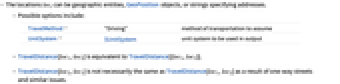 TravelMethod "Driving" method of transportation to assume UnitSystem $UnitSystem unit system to be used in output - TravelDistance[loc1,loc2] is equivalent to TravelDistance[{loc1,loc2}].