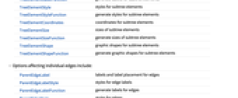 TreeElementLabel labels for subtree elements TreeElementLabelStyle styles for subtree element labels TreeElementLabelFunction generate labels for subtree elements TreeElementStyle styles for subtree elements TreeElementStyleFunction generate styles for subtree elements TreeElementCoordinates coordinates for subtree elements TreeElementSize sizes of subtree elements TreeElementSizeFunction generate sizes of subtree elements TreeElementShape graphic shapes for subtree elements TreeElementShapeFunction generate graphic shapes for subtree elements - Options affecting individual edges include: