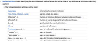directions »Alls use size s for all nodes » TreeCases[pattern]s use s for nodes with data matching pattern » "Leaves"s use s for leaves » "NonLeaves"s use s for non-leaves » {pos1s1,pos2s2,…} use si for the node at relative position posi » {patt1s1,patt2s2,…} use si for nodes at positions matching patti » - TreeElementSizes for a number s is taken to be TreeElementSize{"Nearest",s}.