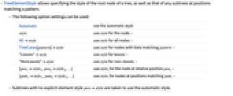Automatic use the automatic style style use style for the node » Allstyle use style for all nodes » TreeCases[pattern]style use style for nodes with data matching pattern » "Leaves"style use style for leaves » "NonLeaves"style use style for non-leaves » {pos1style1,pos2style2,…} use stylei for the node at relative position posi » {patt1style1,patt2style2,…} use stylei for nodes at positions matching patti » - Subtrees with no explicit element style posstyle are taken to use the automatic style.